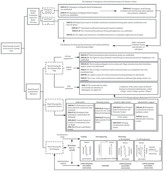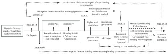 In the context of the Dujiangyan region, the reconstruction of rural residences follows a bifocal managerial approach encompassing reconstruction goal management and re-construction process management. The crux of reconstruction goal management revolves around the strategic imperative of effecting a seamless culmination of housing reconstruction initiatives within a concise biennial temporal span (as depicted in Figure 3). Noteworthy temporal milestones encompass the accomplishment of transitional resettlement within the tri-monthly ambit subsequent to seismic events; the fruition of development intentions pertaining to housing reconstruction within the hexa-monthly aftermath of the seismic occurrence; and the consummation of permanent domicile construction endeavors within the biennial post-seismic timeline, notably culminating on 12 May 2010.