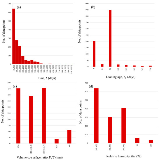 Histograms of input data relating to testing parameters: (a) time, (b) loading age, (c) volume-to-surface ratio and (d) relative humidity.