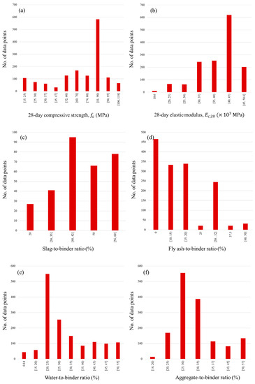 Histograms of input variables relating to concrete properties: (a) 28-day compressive strength, (b) 28-day elastic modulus, (c) slag-to-binder ratio, (d) fly ash-to-binder ratio, (e) water-to-binder ratio and (f) aggregate-to-binder ratio.