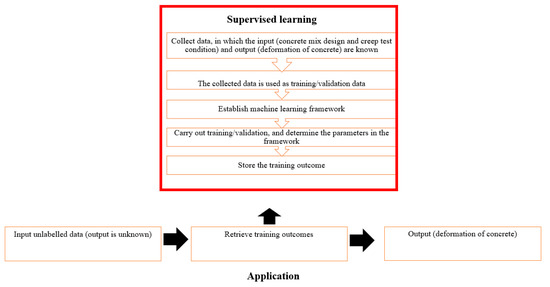 Supervised ML is a subcategory of ML and AI. Typical supervised learning includes learning (or training) and application procedures with the framework shown in Figure 3. It is a standard method for predicting concrete properties, including those relating to strength and durability. In total, 12 factors that are relevant to the concrete and creep test features are used as supervised learning inputs (Table 2). Creep deformation () is the output of the supervised machine learning algorithms.