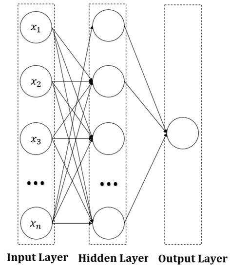 An ANN is a standard supervised ML method composed of artificial neurons (nodes) that simulate our brains’ information transformation. There are various ANN algorithms, and the Back-propagation Neural Network (BPNN) algorithm is one of the most widely used to optimise the neural network training through back-propagation of the error gradient. BPNN’s structure is shown in Figure 4. Hornik et al. [31] proved that a single hidden layer network is good enough to develop reliable predictions for BPNN. Thus, this paper also uses a single hidden layer.