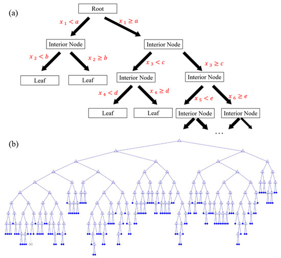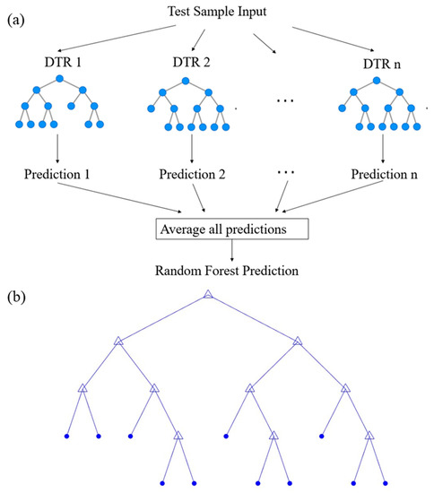 where is the average response of training observations in , and is the average response of training observations in . In this study, data have been divided into training and testing data (70% and 30%, respectively). The study also uses the fitrtree” function in MATLAB (version R2021b) for DTR construction. De Azevedo et al. [34] show the details of DTR.