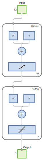 The training and testing are carried out in a MATLAB environment through the Neural Net Fitting Designer toolbox [37]. A sigmoidal tangent function with a linear activation function was considered for hidden nodes in the model, and a linear activation function for the output layer in the model setup, see Equation (1). The ANN model was trained with one hidden layer and one output layer through the LM algorithm. The number of hidden neurons was determined as 2(n + 1) = 26, as it has 12 inputs. Figure 7 shows the ANN’s construction in MATLAB.