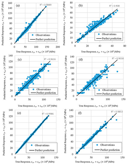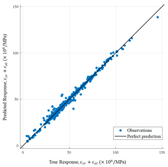 The creep compliance prediction model was developed in MATLAB software using the regression learner tool. The GPR algorithm with various kernel functions was adopted for model training. The length scale and noise standard deviation hyperparameters were taken as 589.9 and 13.77, respectively. A constant basis function and the isotropic kernel were adopted. The input parameters were scaled (standardised), and numeric parameters were locally optimised using the MATLAB advanced options. The dataset was split into training and validation subsets of sizes 70% and 30%, respectively. Table 3 compares the accuracies achieved by each model. High accuracies were observed for all adopted kernel functions with the Matern 5/2, rational quadratic (RQ) and exponential models, each achieving and providing close results for other indicators. The Matern 5/2-GPR model’s predicted response versus the true response for the validation data is shown in Figure 9.