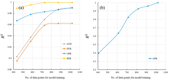 The effect of dataset size is an important parameter that requires further validation. This was examined herein by varying the size of the dataset used for model training and assessing the effect on prediction accuracy. The R2 indicator is plotted against training data size, which ranges from 436 (30% of the total dataset) to 1019 data points (70% of the total dataset) for the RQ-GPR, ANN, DTR and RFR models, see Figure 10a. Data points were removed at random to reduce dataset size. It can be seen that R2 converges for the DTR, RFR and GPR models when the training data size reaches approximately 800 data points. The ANN model converges at approximately 860 data points. In this paper, the number of training data is 1019. Therefore, the training of ANN and DTR can achieve a high accuracy for concrete creep prediction. The R2 for RFR is always above 0.98 for the data size from 436 to 1019. This indicates that RFR performs better when there is a limited sample size.