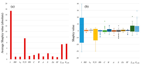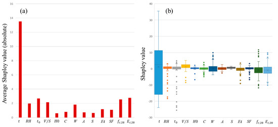 In order to ensure a high representation of the data, the query points were selected herein using 3–4 data points from every creep curve available in the dataset that included the initial time and final time of the creep test. The Shapley values were computed using the developed RQ-GPR model and the “explainer” function in MATLAB. Figure 11a,b depicts the averaged Shapley values (absolute) and the Shapley value distribution, respectively, for slag concretes. In order of decreasing significance, the input variables are found to be and . Aside from time, was the most influential variable and was mostly negatively correlated with creep compliance. This indicates that an increasing results in decreasing creep strain. The averaged Shapley values for and were similar with both parameters featuring a strong influence on creep compliance prediction. The remaining input variables were noticeably less influential, particularly and . The lower importance of and may be attributed to their low variability in the dataset. Most tests on the slag concrete commenced at 28 days, and the varied only from 45–65%.