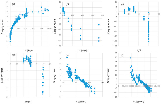 Shapley values versus input parameters: time since loading (a), age at loading (b), volume-to-surface ratio (c), relative humidity (d), 28-day compressive strength (e) and 28-day elastic modulus (f).