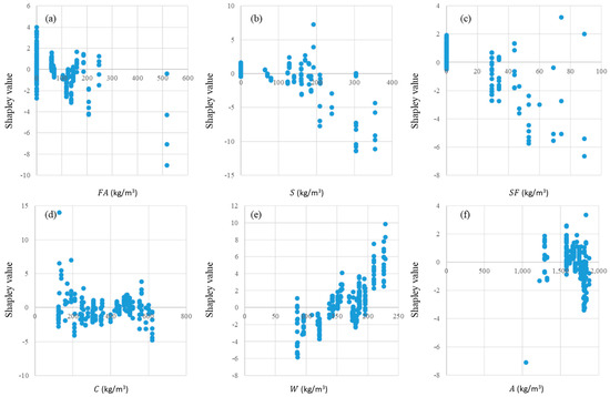Shapley values versus input parameters: fly ash content (a), slag content (b), silica fume content (c), cement content (d), water content (e) and total aggregate content (f).