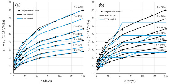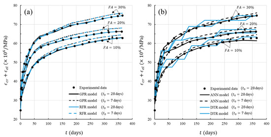 Predictions of GPR and RFR (a) and ANN and DTR (b) model compared to experimental data for fly ash concrete including varied loading age.