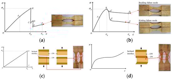 - There are two failure modes of wood observed under parallel-to-grain cyclic compression, namely buckling and shear. The stress–strain curve with the former failure characteristic shows that the stress after the peak point decreases smoothly and slowly with the increase in load, and the specimen has two damage bands. The stress–strain curve of the latter shows that the stress decreases suddenly and then rises slowly, and there is one kinking and torsion damage zone in the specimen.