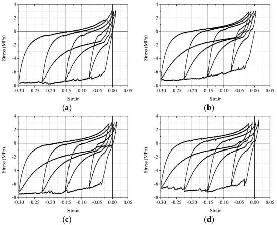 - In the third stage, when the strain at the compression unloading point is less than −0.05, the reload curve is characterized by the first formula of Equation (10), and the corresponding parameter values are = −4.52 MPa, = 7.14 MPa, and = 81.34.