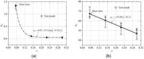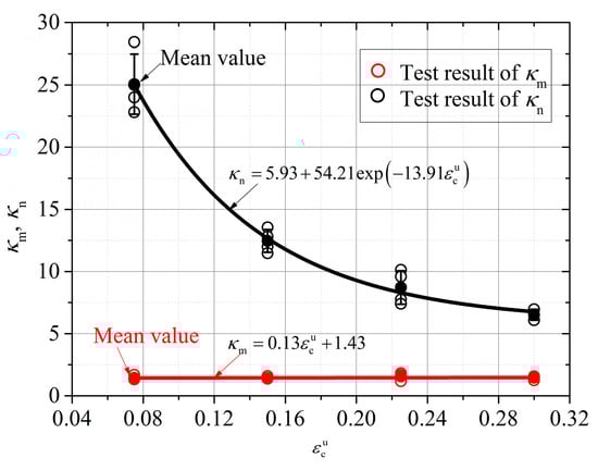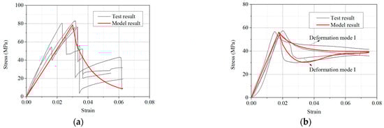 - When (considering stress drop), Equation (10) is adopted, and the relevant parameters are a drop point strain of 0.038 and a drop stress of 27.3 MPa. The values of the other parameters are = −8.1 MPa, = 11.7, and = 32.6.