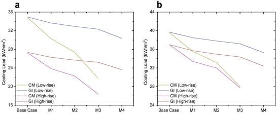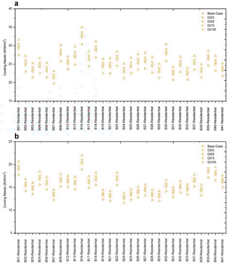 4.2. Effects of Increased Urban Vegetation on Building Cooling Loads