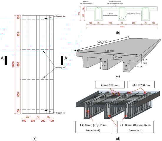 Details of control specimen S-C (dimensions are in mm): (a) plan view showing concrete dimensions; (b) section (A-A) showing concrete dimensions and steel reinforcement in ribs and top slab; (c) isometric view showing concrete dimensions; (d) isometric view of reinforcement.