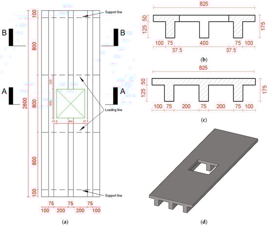 The dimensions of each slab were 2600 mm (length) × 825 mm (width) × 175 mm (thickness). The openings were square (side length = 400 mm), which included cutting the middle rib. It should be mentioned that in the labeling of slabs seen in Table 1, the letter “S” stands for slab specimen; the symbol “FO” signifies flexure opening; the letter “C” denotes control specimen; and the symbol “S1” stands for strengthening scheme 1, and “S2” denotes strengthening scheme 2. As identified in Figure 1 and Figure 2, each specimen had three ribs and a top slab. Each rib had longitudinal reinforcement of 2∅8 mm bottom rebars and 1∅8 mm top rebar, in addition to transverse stirrups of ∅6 mm at 200 mm spacing. The thickness of the top slab was 50 mm, and it was reinforced in both ways with ∅6 mm rebars spaced at 250 mm (see Figure 1).