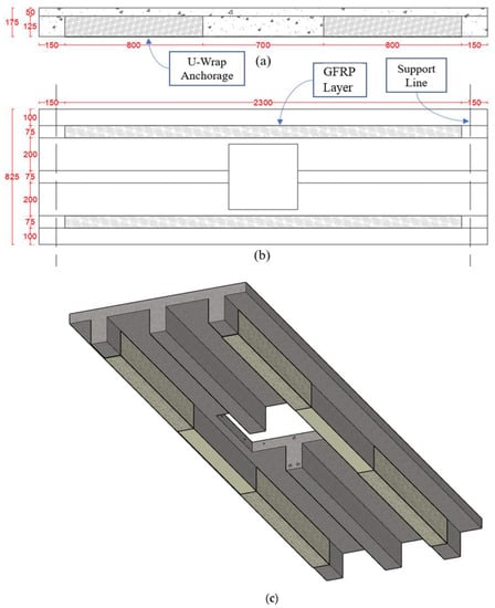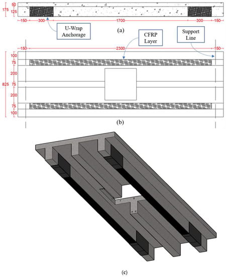 Details of strengthened specimen S-FO-S1 (dimensions are in mm): (a) side view; (b) bottom view; (c) isometric view.