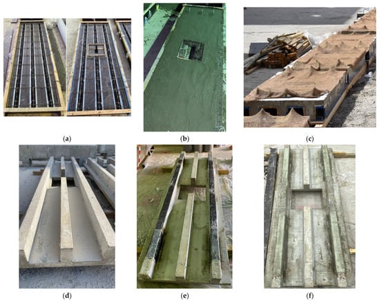 Preparation of test specimens: (a) formwork with steel reinforcement for specimens with and without flexure opening; (b) concrete casting; (c) curing of concrete; (d) sandblasting of ribs for strengthening; (e) strengthening of specimen S-FO-S1 using CFRP composite sheets; (f) strengthening of specimen S-FO-S2 using GFRP composite sheets.