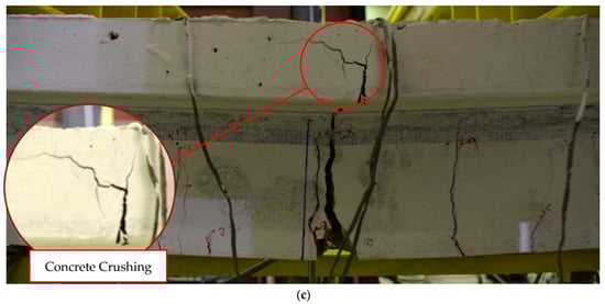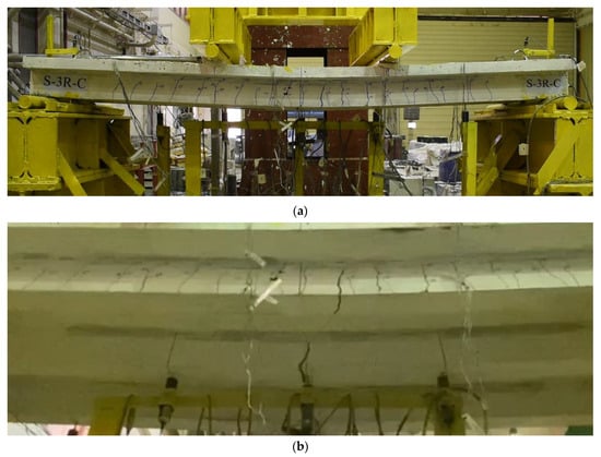 Figure 7 shows the failure mode of reference slab S-C. The first visible major flexural crack for specimen S-C was observed at a loading of 22 kN (near the mid-span of the specimen), and it was consistent in the three ribs. The slab failed progressively in flexure as the failure occurred first in the middle rib, and it was subsequent by one of the edge ribs. Ultimately, the third rib failed in flexure. In each rib, flexural failure was identified by fracture of the bottom steel rebars at the location of the major flexural cracks, and it was succeeded by crushing of concrete on the top side of the slab, as seen in Figure 7.
