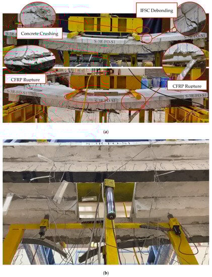 Figure 9 presents the mode of failure for strengthened slab S-FO-S1. As clarified, the failure mode of the left rib was different from that of the right rib. In the right rib, the initial major flexural crack was noted at a loading of 20 kN (near the mid-span of the specimen). With the increase in mid-span deflection, the flexural cracks spread into the maximum-moment region. At the ultimate load of 64 kN, a rupture was noticed in the bottom CFRP layer with delaminating of the bottom concrete cover, and the load suddenly dropped. However, in the left rib, the first major crack was observed close to the loading line, and it was a flexure-shear crack, which extended from the bottom surface toward the compression zone at the top. Upon rupture of the CFRP laminate in the right rib, an intermediate flexure-shear crack (IFSC) debonding was noticed in the left rib at the CFRP/concrete interface. IFSC debonding is induced by a geometric discontinuity of a strengthened member at the location of flexural or shear/flexural cracks [,]. The final failure of the slab was owing to the fracture of the bottom steel rebars of the right rib, which was associated with crushing of concrete on the compression side. Nevertheless, the fracture of steel rebars was not observed in the left rib.