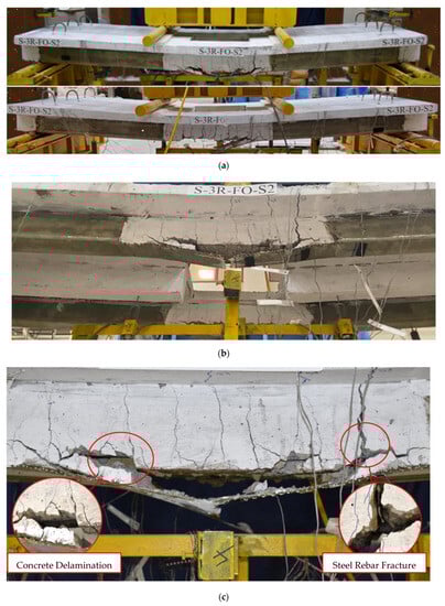 Figure 8 shows the failure mode of control slab S-FO-C. The first major flexural crack for specimen S-FO-C was observed at a loading of 12 kN (near the mid-span of the specimen), and it was consistent in the two edge ribs. The slab failed progressively in flexure, and the right rib (back rib) failed first owing to the fracture of the bottom steel rebars at the location of a major flexural crack at the peak load of 38 kN. This failure was succeeded by crushing of concrete on the compression side of the right rib. Subsequently, the load went down to about 18 kN, and failure occurred in the left rib (front facing) owing to the fracture in the bottom steel rebars, at which the load dropped down. The failure was also superseded by crushing of concrete on the top of the left rib zone, as seen in Figure 8.