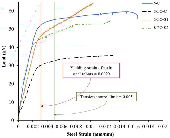 Load versus strain curves in FRP laminates at mid-span for the strengthened specimens S-FO-S1 and S-FO-S2 are illustrated in Figure 13. It was identified from Figure 13 that the FRP contribution was almost null in the initial uncracked stage. Upon concrete cracking, the FRP contribution became pronounced, and the measured FRP strains in the two upgraded slabs increased until they reached a value of about 0.004 at a load close to the yielding load. Subsequent to steel yielding, the FRP contribution became more significant, and the FRP tensile strains considerably increased until higher values, as seen in Figure 13. Table 4 lists peak strains in FRP sheets at mid-span of strengthened specimens S-FO-S1 and S-FO-S2. It should be noted that even though rupture occurred in FRP sheets in the two strengthened specimens, this was not reflected in Table 4 and Figure 13, as the peak FRP strains in the two specimens were considerably less than the corresponding rupture limit, especially for the CFRP-strengthened specimen S-FO-S1. The reason is that the failure location occurred away from the strain gauge location. However, for GFRP-strengthened slab S-FO-S2, the failure of GFRP sheets occurred near the location of the strain gauge, which recorded a strain of 86% of the rupture limit, as seen in Table 4.