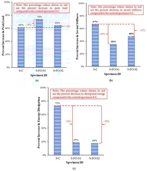 Comparison of tested specimen with regard to percent increase in: (a) peak load; (b) secant stiffness; (c) dissipated energy.
