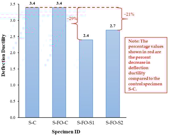 Figure 15 shows a comparison between all tested specimens for deflection ductility. The deflection ductility was not influenced by the existence of the flexure opening in slab S-FO-C compared to the slab without opening (S-C). However, compared with the control slabs S-C and S-FO-C, strengthening schemes reduced the deflection ductility by 29% and 21% for specimens S-FO-S1 and S-FO-S2, respectively, as shown in Figure 15 and Table 3.