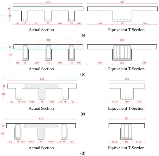 The control specimen with flexure opening consisted of two full ribs and a discontinuous third rib. The third rib (middle rib) had a single opening in the peak-moment region. In the analysis, the discontinuous rib was neglected, and the two continuous edge ribs were assumed to carry the load. The whole slab was treated as an equivalent T-section in bending, with the effective flange width be taken as 425 mm, as illustrated in Figure 16c,d. The ultimate load of the specimens was computed using the same approach detailed in Equations (1)–(9).