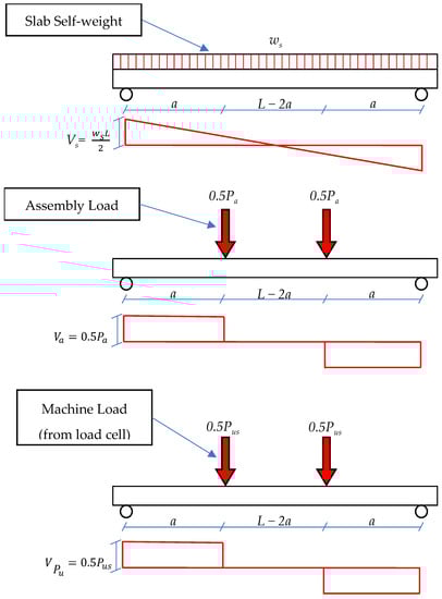 For the tested specimens, the shear strength is the summation of three components: (1) the contribution of the slab self-weight; (2) the shear force resulting from the weight of the steel assembly; and (3) the shear force induced by the machine. The shear force diagrams of the three components are depicted in Figure 18.