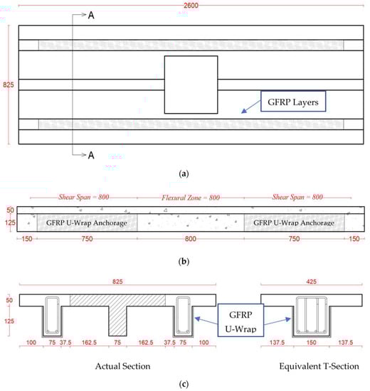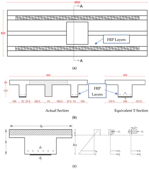 For FRP-upgraded specimens with flexure opening (S-FO-S1 and S-FO-S2), only one critical section at the mid-span was considered for computing the ultimate flexural capacity, which was calculated as per the ACI 440 guidelines []. Similarly to the control slab with flexure opening, the middle rib was ignored in the calculations, and each of the FRP-upgraded specimens was treated as an equivalent T-section in bending, with the effective flange width be taken as 425 mm, as seen in Figure 19. Steps for calculation of the flexural capacity are detailed below.