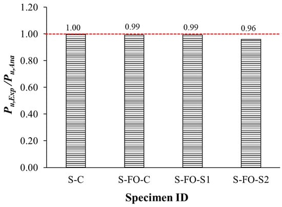 In the current research, the flexural and shear strengths of unstrengthened specimens (S-C and S-FO-C) were estimated using the ACI 318-19 code [], whereas for FRP-upgraded specimens with flexure opening (S-FO-S1 and S-FO-S2), the ultimate flexural and shear capacities were calculated using the ACI 440.2R-17 guidelines [].