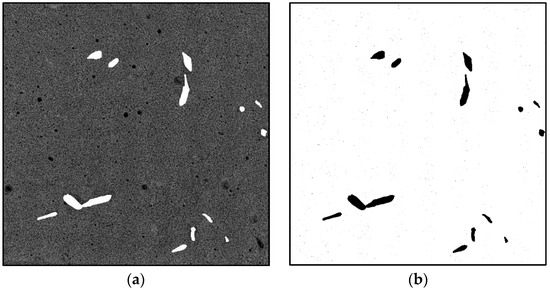 Calculation and elimination of the amount of hemp shives. Image size is 10,000 × 10,000 pixels. (a) We paint the hemp shiv particles in white (b) calculate the area of hemp shiv particles.