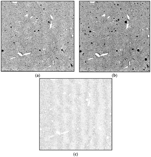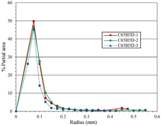 We operated image analysis to evaluate the pore surface distributions of the samples. The homogeneity of the distributions was verified using measurements operated on 3 different sections for each sample (Figure 6 and Figure 7). Whatever the measured section, the pore distributions peak for their maximum at 0.08 mm radius pores (Figure 6), corresponding to a partial area around 45–50% of the apparent total pore section.