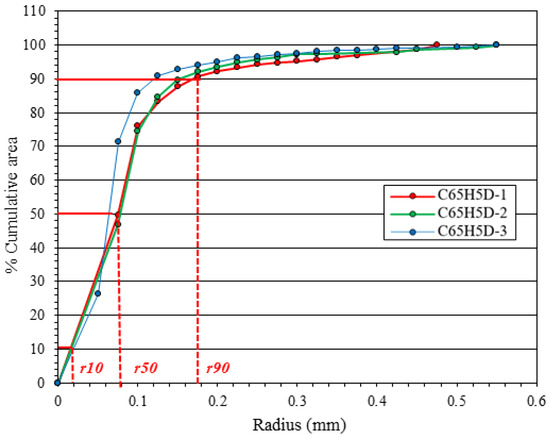 We illustrate the effects of cement replacement by pozzolanic additions (Table 5) on the pore-size distribution of BFCs, comparing one sample without pozzolan addition (C100H0) to one with 30% addition (C70H0 with 20 wt% of GGBFS and 10 wt% of MK). Each sample is elaborated using the two methods, without HS addition. From image analysis, the mean pore radius (Rm), their pore-size-distribution (PSD), and the uniformity coefficient (UC) of the samples provide a macroscopic measure of pozzolan addition effects (Table 5 and Figure 8). In the literature, pore-size distribution is considered uniform if UC = r90/r10 = 1, with a decreasing homogeneity for increasing UC ratio [27].