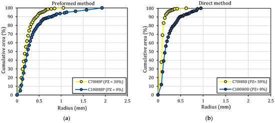 Cumulative pore fraction versus their radius for the two pozzolan fractions: (a) preformed and (b) direct methods.