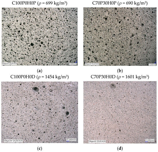 The pore-size refinement upon pozzolan additions is also visible directly from microscopic images (Figure 9, compare Figure 9a,c to Figure 9b,d images). The main effect of pozzolanic additions is to ensure cohesion between particles and fill voids which blocks the coalescence of pores, resulting in their smaller size and larger uniformity, also reflected in the PSD (Figure 8) as smoother curve evolutions for C70HO samples. This smoothing effect is observed by the disappearance of large pores (Figure 9c) giving rise to the angular variations of the PSD around 0.5 mm radii (Figure 8b) upon pozzolan addition (Figure 9d).
