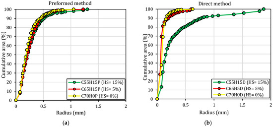 Cumulative pore area versus radius of BFCs incorporating various amounts of hemp shiv (HS) using: (a) preformed method, (b) direct method.