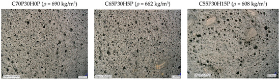 Optical microscopy images of the porous structures evidence their invariance upon hemp shiv addition using the preformed method (Figure 11). Whatever the HS content, pore sizes and distribution are constant and hemp shiv is coherently integrated into the BFC matrix with no visible interface between HS and the matrix at these magnifications. Using the direct method (Figure 12), large pores are developed upon HS addition, via pore coalescence, and consequently, both UC and Rm are increased by a factor of nearly 2. However, in this case, contrary to the preformed samples, a low cohesion between the hemp shives and the cement matrix is observed and results in a larger pore size distribution [34,45]. This decrease in pore size uniformity may consequently affect the mechanical resistance.