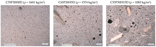 Table 2 demonstrates that the absolute density of pozzolanic admixtures is slightly lower than that of cement. However, when comparing the total density in Table 4, it is observed that C100H0D (foamed concrete with 100% cement content and no hemp) has a lower density than C70H0D (foamed concrete with 70% cement content and no hemp). This can be explained by the fact that the direct method of foamed concrete production is relatively challenging to control. It depends on various parameters, including mixing time, mixing speed, quantity of surfactants, water quantity, and the constituents of the formulation [3]. These factors can influence the overall density of the resulting foamed concrete and lead to variations in density between different compositions.