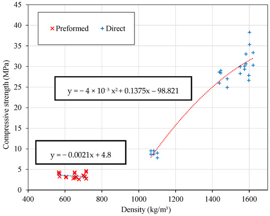 The large difference in compressive strengths in favour of concretes produced by the direct method is mainly an effect due to their larger density (see Section 3.1). Some studies showed an exponential evolution of the compressive strength with density [3,24], and this is also what we observe in our samples (Figure 13).