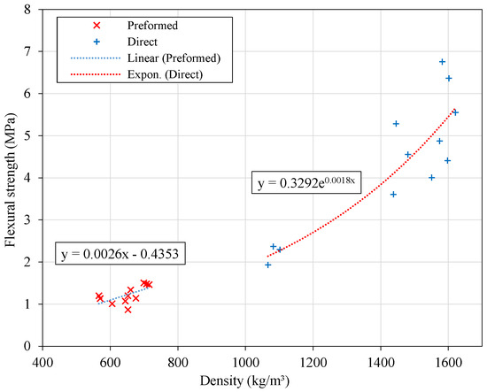 Similarly, as for the compressive strength, the evolution of flexure strength (Figure 14) with density in the foamed concretes exhibits a behavior compatible with an exponential character.