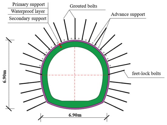 | Advance support | Forepole: advanced steel pipe | Location: upper 160° range of tunnel roof; Diameter of pipes: 42 mm; Length of pipes: 5 m; Spacing of pipes: 0.35 m |