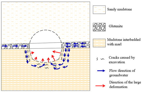 - The occurrence mechanism of the large deformation in the rocks surrounding the tunnel is closely related to the strata structure, lithological distribution of the tunnel section, and water recharge from the gully.