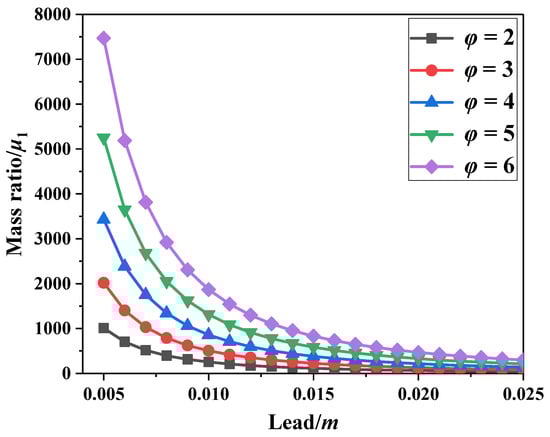 where . As shown in Equation (8), the equivalent inertia coefficient was closely related to the lead of the ball screw. The relationship between the mass ratio and screw lead is illustrated in Figure 2 and Figure 3.