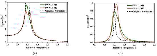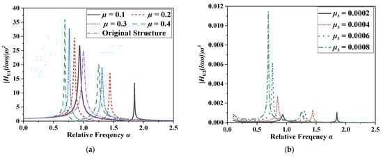 Displacement transfer function curve of SDOF-PID (ξ1 = 0.02, δ = 0.3). (a) Displacement response U1, (b) Displacement response U2.
