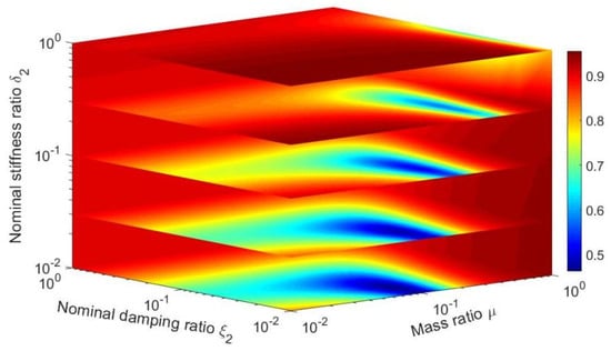 Figure 6 shows that the smaller the nominal stiffness ratio, the larger the area of better damping (blue area in Figure 6) that can be obtained was. In other words, the smaller the nominal stiffness ratio δ2, the larger the range of the mass ratio μ was; further, the nominal damping ratio ξ2 could be selected to ensure a better decreasing rate. Thus, the nominal stiffness ratio δ2 was set as 0.01 to continue studying other parameters.