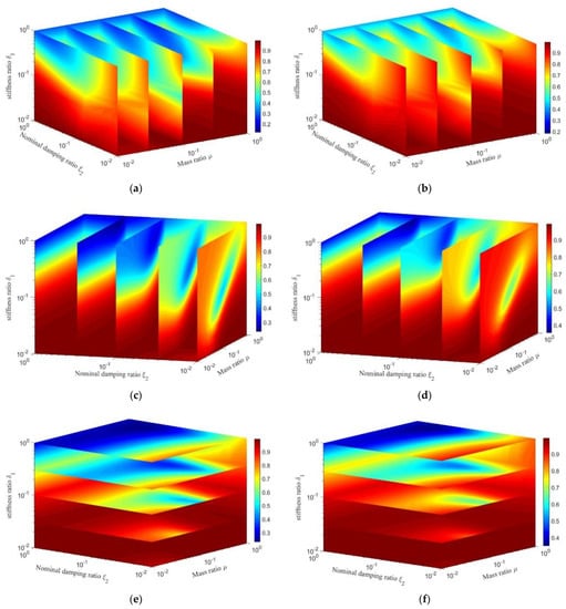 Equation (45) indicates that the optimal nominal damping ratio and stiffness ratio are both related to the mass ratio μ and nominal stiffness ratio δ2. Simultaneously, the fixed-point theory does not consider the influence of the inherent damping of the SDOF. Therefore, and obtained by the fixed-point theory can be used as approximations for the SDOF-PID with smaller inherent damping [].