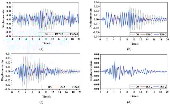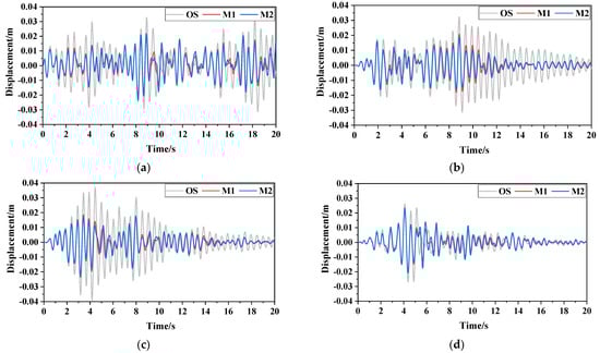 Following with the above design parameters, the displacement time–history curves of the SDOF-PID designed using different optimisation design methods are presented in Figure 11. The displacement time–history curves of the SDOF with different dampers designed using the fixed-point theoretical optimisation design method are illustrated in Figure 12.