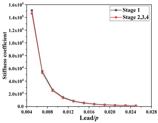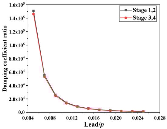 Equations (A5), (A7), (A9) and (A11) show that the equivalent inertia coefficient, equivalent damping coefficient, and equivalent stiffness coefficient of the PID are closely related to the lead of the ball screw. The relationship between the damping coefficient ratio and lead as well as the relationship between the stiffness coefficient ratio and lead are shown in Figure A2 and Figure A3.