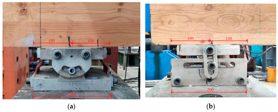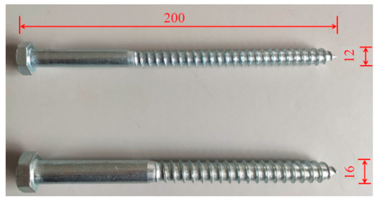The steels used in this test mainly include the reinforcing bars, bearing supports, and coach screws. The strength grade of the steel made for the reinforcing bars and coach screws was S355 with a yield strength of 345 MPa and a modulus of elasticity of 200 GPa. The bearing supports were manufactured with high strength steel with a yield strength of 640 MPa and a modulus of elasticity of 210 GPa. The diameter of the reinforcing bars was 8 mm at a spacing of 150 mm. The thickness of the bearing support plate was 30 mm. Coach screws with diameters of 12 mm or 16 mm and a length of 200 mm were used as the timber–concrete interfacial connections, as shown in Figure 1.